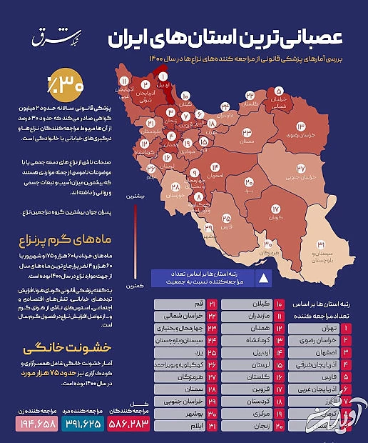 بر اساس گزارش سال ۱۴۰۰ سازمان پزشکی قانونی، استان های تهران با ۹۶,۴۹۶ ، خراسان رضوی با ۵۱,۶۳۰ و اصفهان با ۴۱,۰۶۴ نفر بیشترین و استان های ایلام با ۳,۴۹۰ ، بوشهر با ۳,۶۴۱ و خراسان جنوبی با ۴,۱۶۴ نفر کمترین آمار ارجاعات نزاع را داشته اند.