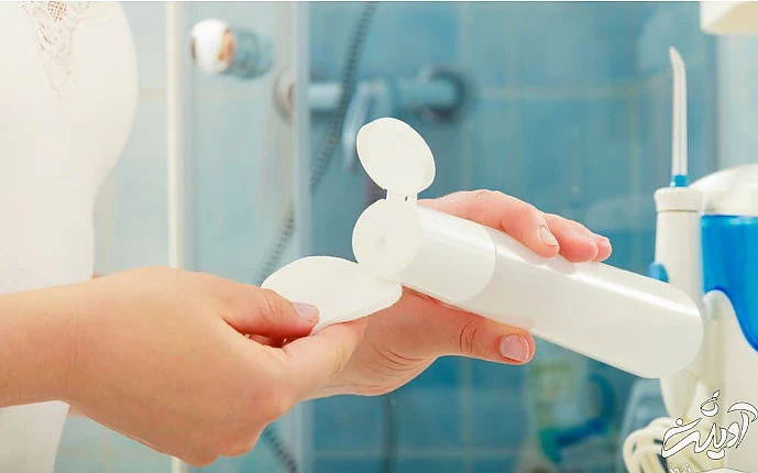 - مقداری از تونر را بر روی پد پنبه ای بریزید: تونر را به قدری بر روی پد پنبه ای (دیسک پنبه) بریزید که پد شما مرطوب شود. اما توجه کنید که پد نباید به صورت کامل خیس شود.
