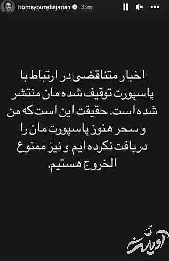 همایون شجریان خواننده موسیقی سنتی می گوید او و سحر دولتشاهی بازیگر سینما پاسپورت خود را دریافت نکرده اند و هنوز ممنوع الخروج هستند.
