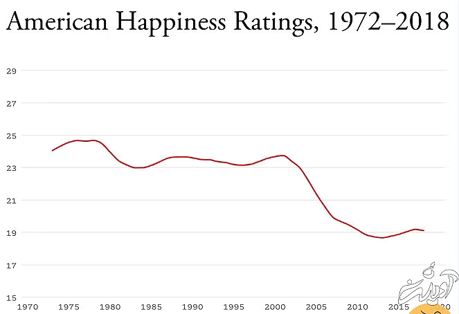 در سال ۲۰۰۰ میلادی امریکاییها مردمانی شاد بودند. با این وجود، ده سال پس از آن به طور متوسط شادی در میان آنها کاهش پیدا کرد. نمودار رتبهبندی شادی امریکاییها به این صورت است: خطی که از دهه ۱۹۷۰ میلادی آغاز میشود و به دنبال آن یک فرو رفتگی قابل توجه که در حوالی هزاره جدید رخ داده است. چرا چنین تغییر ناگهانیای رخ داد؟
