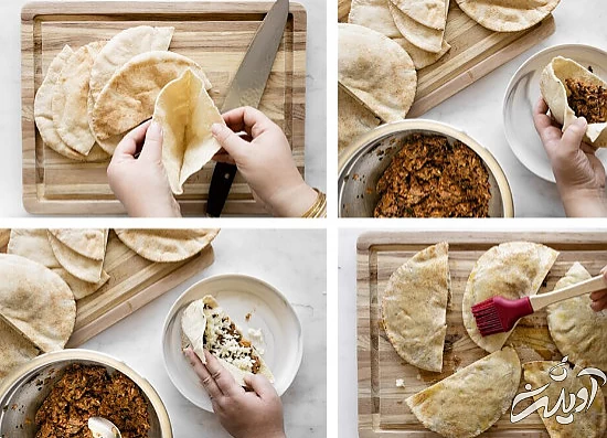 نان پیتای گرد را از وسط برش بزنید و به چهار قسمت مساوی تقسیم کنید که هر قسمت شبیه برش پیتزا حالت مثلثی داشته باشد. حالا لای نان را از یک سمت نوک مثلثی باز کنید و یک قاشق سرپر از موادی را که آماده کردهاید، داخل لایه نان بگذارید و دو لایه را خوب به هم فشار بدهید تا مواد پخش شود. همه تکههای نان را طبق شکل زیر به همین روش آماده کنید.